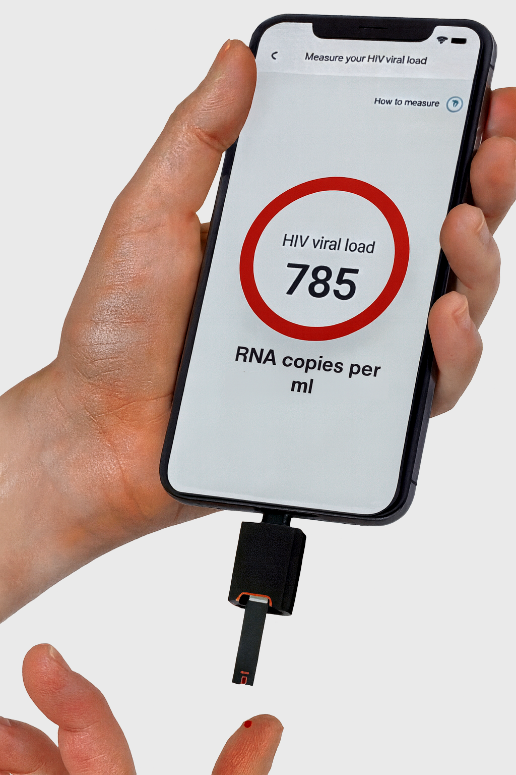 Connect potentiostat to the smartphone, and insert a VL sensor test strip in the potentiostat as indicated